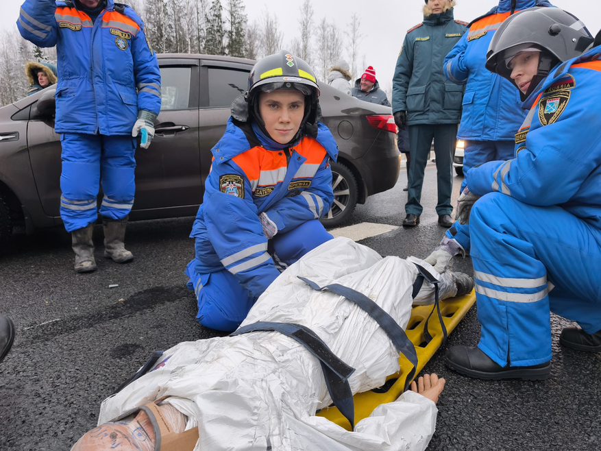 Перед спасателями стояла задача по деблокированию условного пострадавшего из поврежденного автомобиля и его передаче сотрудникам скорой помощи.