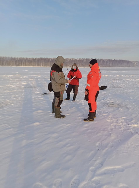 При проведении профилактических мероприятий спасатели беседуют с рыбаками об опасности выхода на лёд.