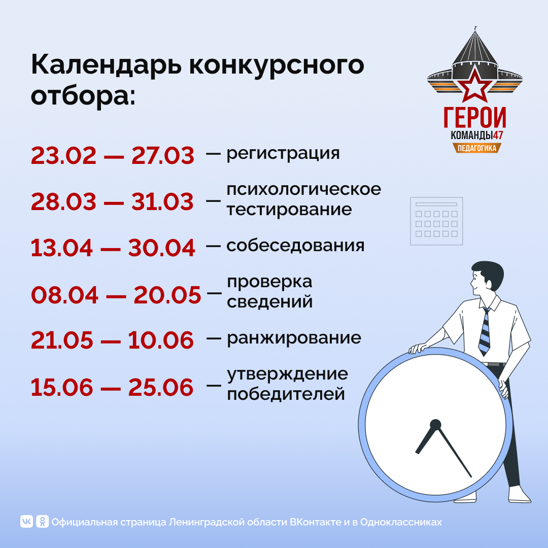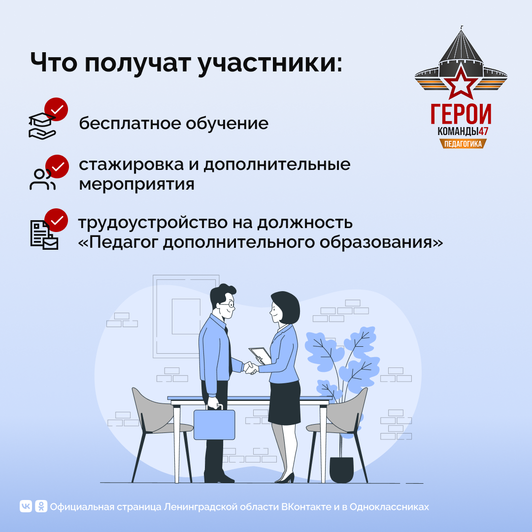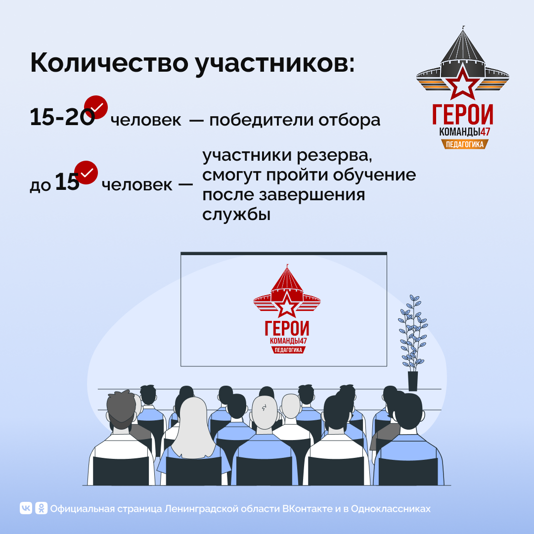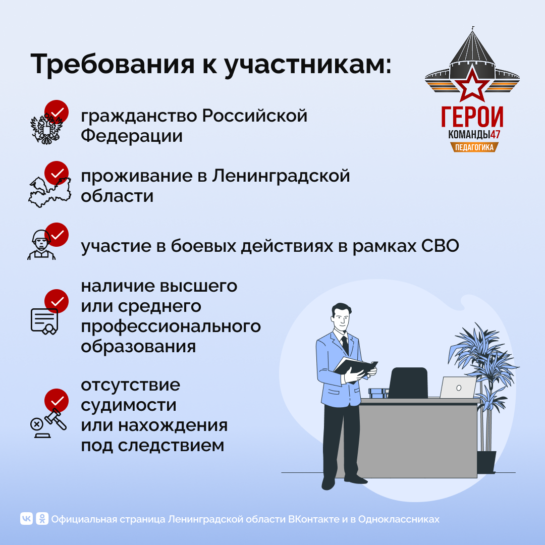 С 23 февраля 2026 года запущен прием заявок на участие в конкурсном отборе второго потока по реализации программы Ленинградской области «Герои Команды 47» по направлению «Педагогика» для участников и ветеранов специальной военное операции.