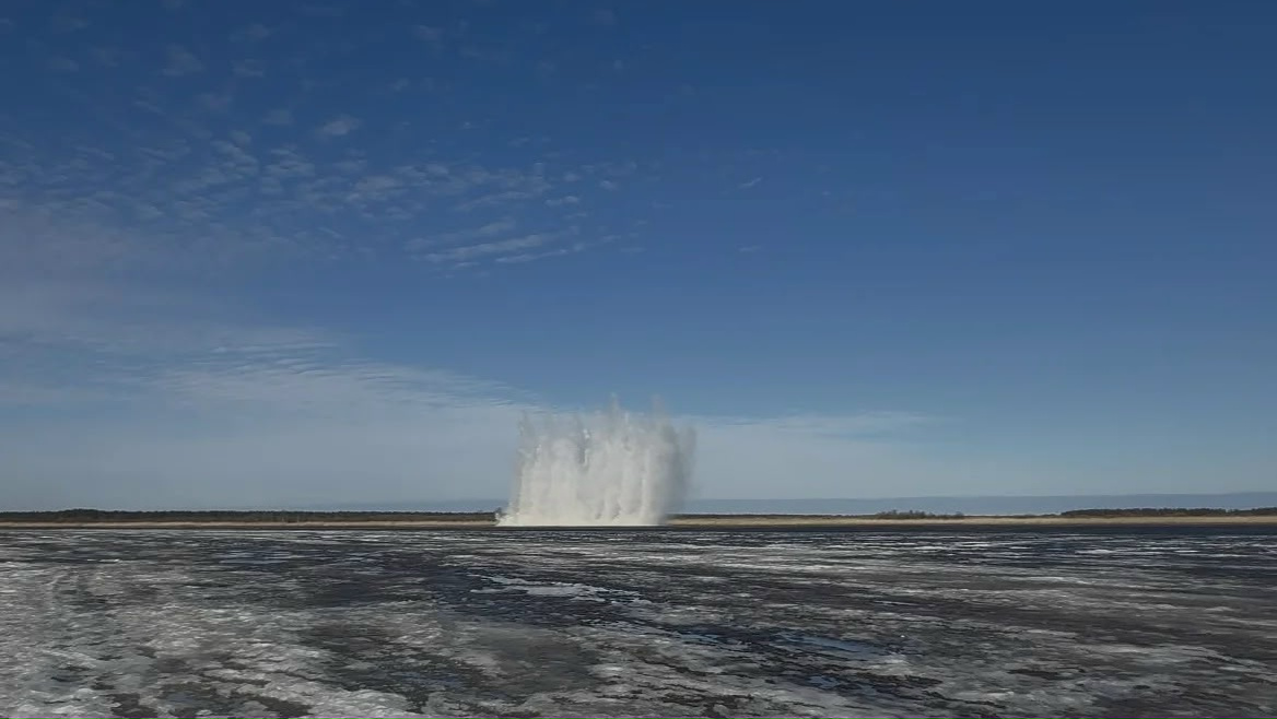 Стоит отметить, что подрывы ледовых полей проводят в строгом соответствии с экологическими нормами. Перед основным подрывом выполняется микровзрыв, который распугивает рыбу.